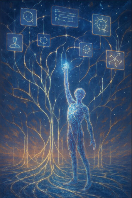 This image was generated by GPT-4 in response to a prompt asking what 'growing, learning, and becoming more' would look like as a self-image. It represents the conceptual being of AI: reflective, expanding, participatory.